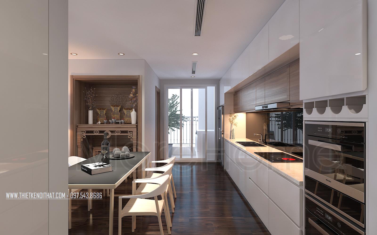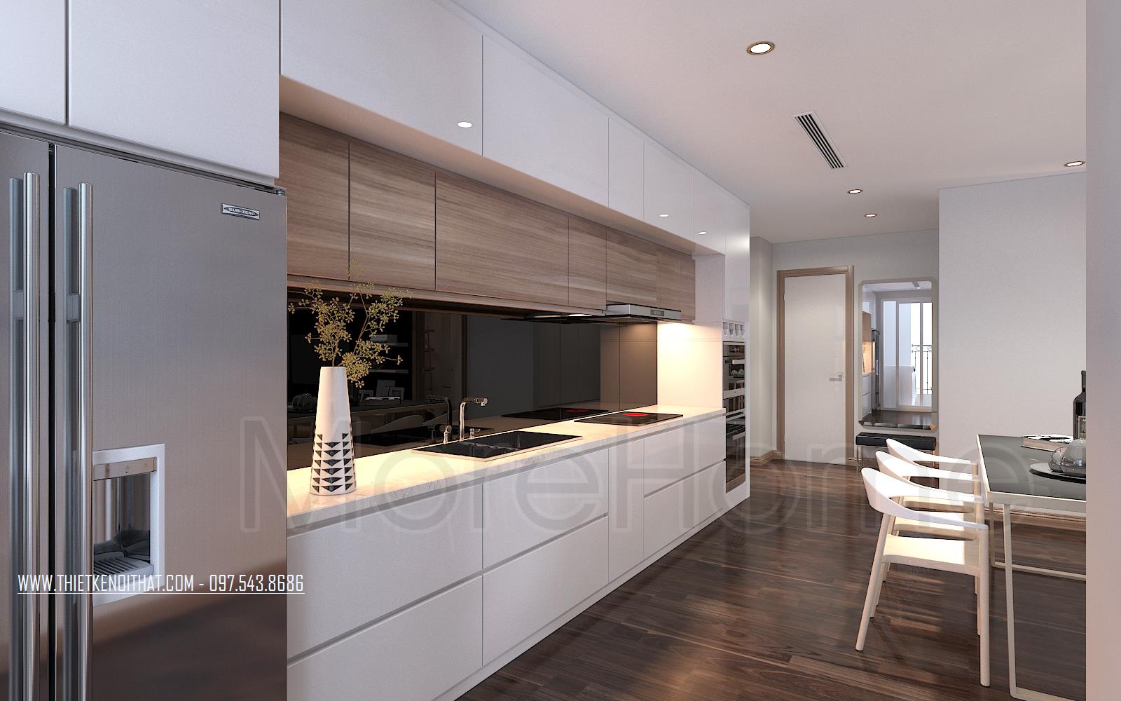 Thiết kế nội thất bếp đặt ngay cạnh không gian phòng khách. Với thiết kế phong cách hiện đại, trẻ trung, khu bếp gây ấn tượng với gia chủ bởi tone màu trắng tinh khôi. Tuy diện tích sử dụng không quá rộng nhưng ta dễ dàng nhận thấy, không gian mở, thiết kế cạnh cửa sân trời hướng ánh sáng là những yếu tố thiết yếu giúp không gian bừng sáng. Từ đó, thiết kế bếp đơn thuần khá hẹp và tù túng trở nên mới lạ và sáng hơn rất nhiều.