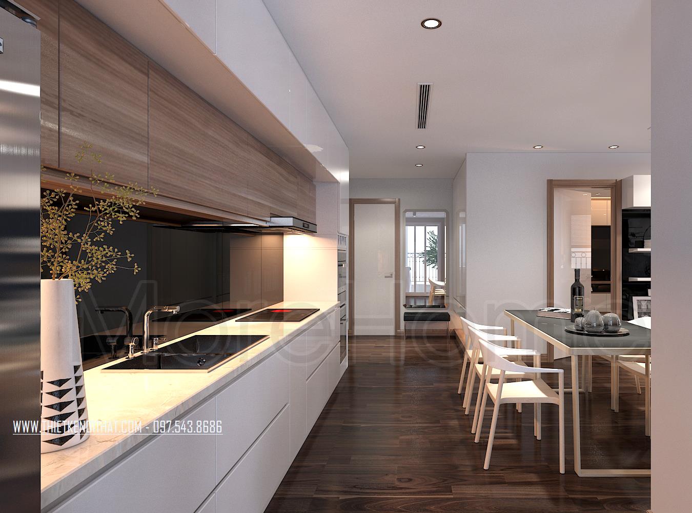 Thiết kế bàn ăn hiện đại là một trong những điểm nhấn linh hoạt nhất của căn hộ thể hiện rõ sự tinh tế trong thiết kế. Không cầu kỳ trong kiểu cách, bàn ăn được tận dụng, sử dụng liền kề ngay gần bếp, gần như liền kề kệ bếp tạo sự liền mạch và nhất quán cho không gian mà lại tiết kiệm được một diện tích đáng kể, không làm ảnh hưởng đến tính công năng mà lại đầy sáng tạo.