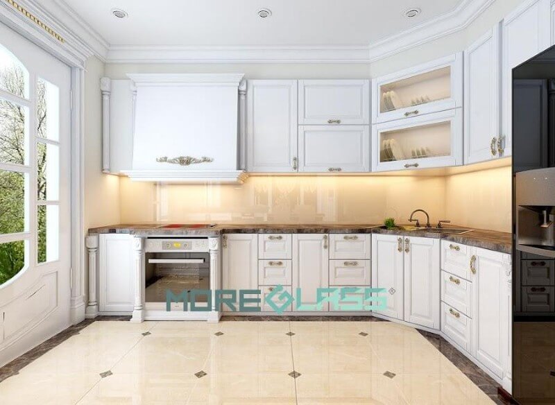 Thiết kế mẫu kính ốp bếp màu kem nhẹ nhàng kết hợp với tủ bếp cùng gam màu cho phòng bếp thêm hoàn hảo, ấm cúng