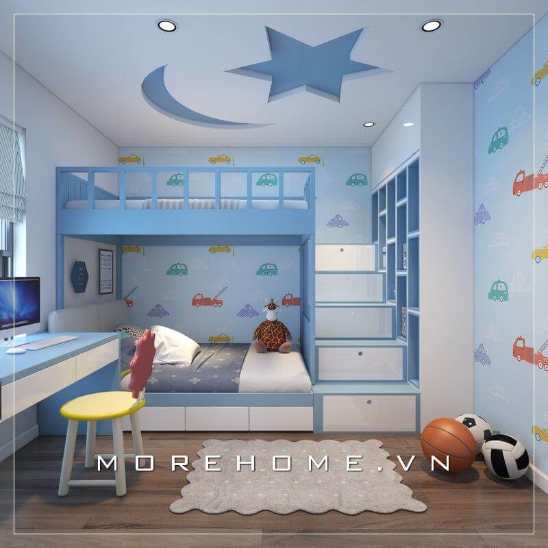 Gợi ý cho bạn cách sắp xếp và bố trí nội thất phòng ngủ 2 bé trai, gam màu xanh chủ đạo được lựa chọn phù hợp với xu hướng hiện nay
