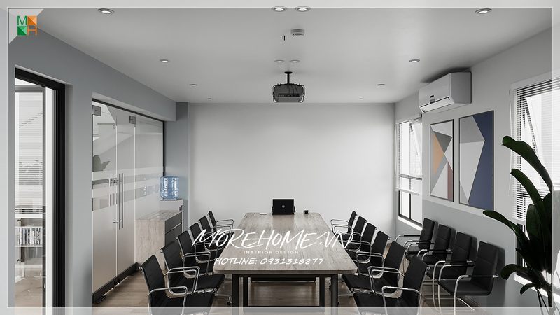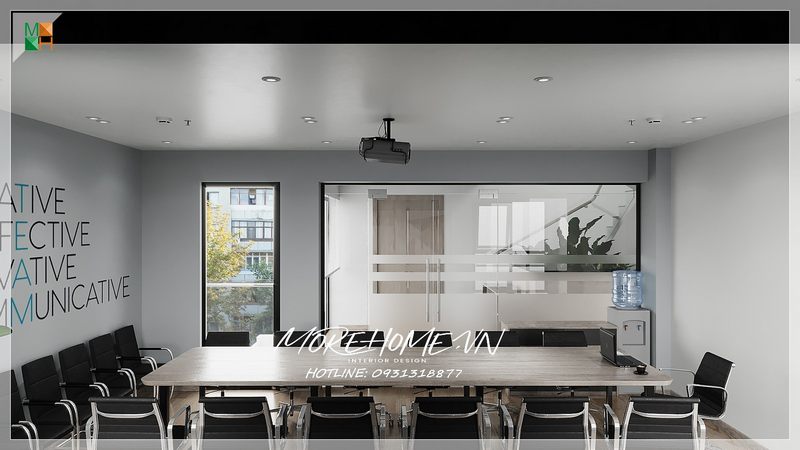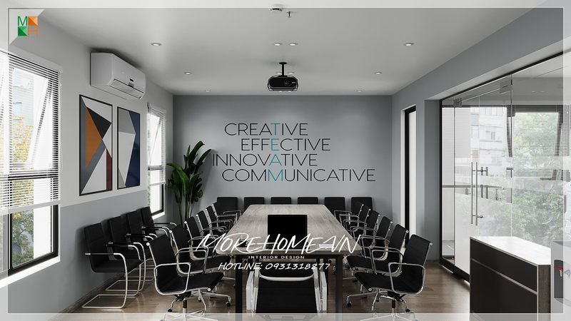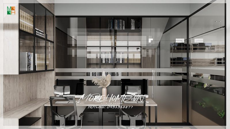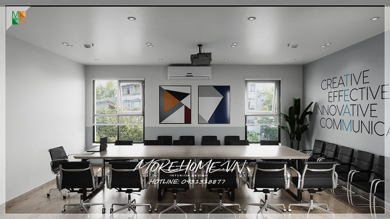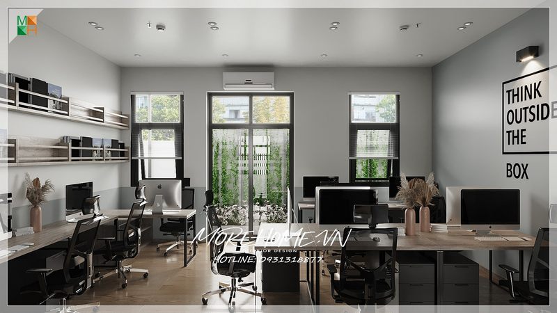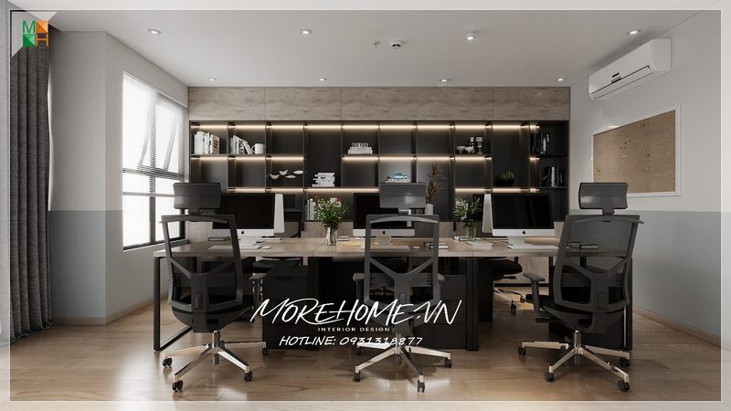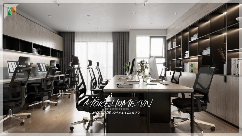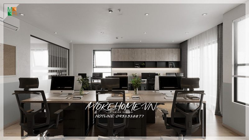 Bàn làm việc bằng gỗ có diện tích rộng với phong cách hiện đại mở đem lại sự thông thoáng cho nhân viên