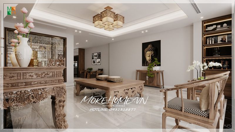 Mẫu bàn thờ gỗ cao cấp với kiểu dáng hiện đại, đường vân gỗ tinh tế được thực hiện tại xưởng gỗ nội thất MoreHome.